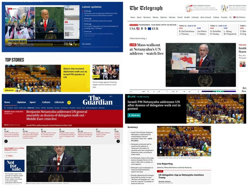 Sky News also described Netanyahu’s speech as “under intense international pressure” in a special report showing images of protests on the streets of New York, adding that the atmosphere at the UN reflected diplomatic and social dissatisfaction with the ongoing war in Gaza more than anything else.